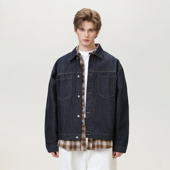 Outono Denim Jacket ajuste solto Turn-Down Collar duplo bolsos motocicleta jaqueta estilo masculino apresentando visível costura Workwear